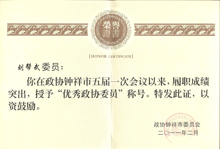 2011年2月劉邦武被授予“優(yōu)秀政協(xié)委員”稱號