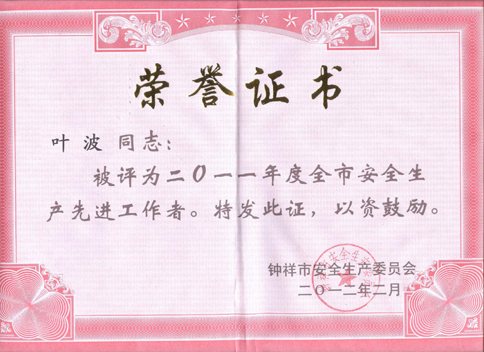 2012年2月葉波同志被評為2011年度全是安全生產(chǎn)先進(jìn)工作者