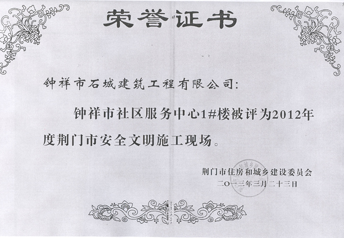 2013年3月被評為2012年度荊門市安全文明施工現(xiàn)場