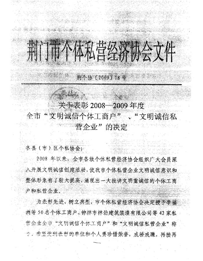 2009年12月榮獲2008-2009年度“文明誠信個體工商戶”